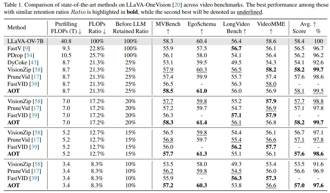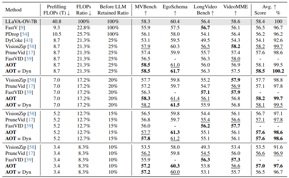 Table 3. Comparison of state-of-the-art methods on LLaVA-OneVision across video benchmarks. The best performance among those with similar retention ratios Ratio is highlighted in bold, while the second best will be denoted as underlined. AOT w Dyn denotes we apply dynamic temporal segmentation to obtain adaptive frames within each clip, following FastVID.