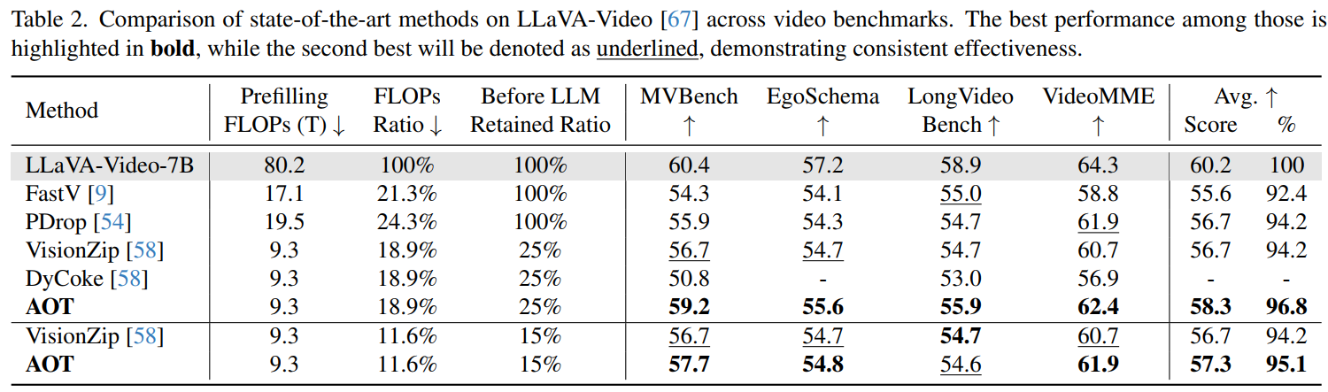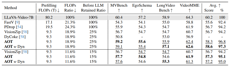 Table 4. Comparison of state-of-the-art methods on LLaVA-Video across video benchmarks. The best performance among those is highlighted in bold, while the second best will be denoted as underlined, demonstrating consistent effectiveness. AOT w Dyn denotes we apply dynamic temporal segmentation to obtain adaptive frames within each clip, following FastVID.
