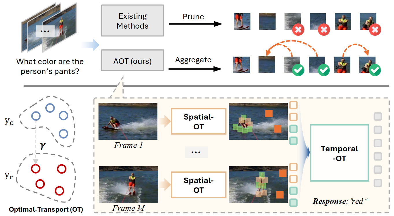 The top is the essential differences compared with common token reduction methods, instead of simply removing unimportant or merging very similar tokens, ours utilizes a global optimization strategy to further exploit and aggregate necessary semantic and context from these onto the remaining tokens. Bottom is our proposed pipeline to adopt Optimal Transport to aggregate information within intra- and inter-frame levels for video tokens.