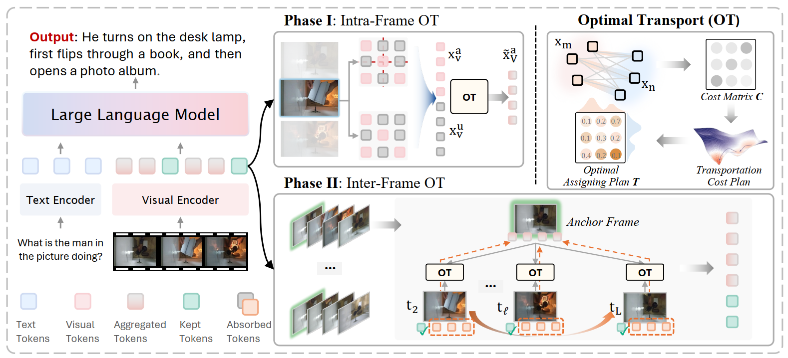 Overall pipeline of our AOT. Our method compresses tokens of video LLMs across spatiotemporal through optimal transport, first establishing token anchors within each frame to cover semantically important and spatially diverse token candidates, then utilizing optimal transport to aggregate the necessary informative cues within Intra-Frame at phase I, and finally shifting the optimization strategy into temporal within Inter-Frame at phase II. The proposed AOT preserves both temporal and visual integrity by utilizing efficient SinkhornKnopp Iteration to solve the optimal transport plan assignment.